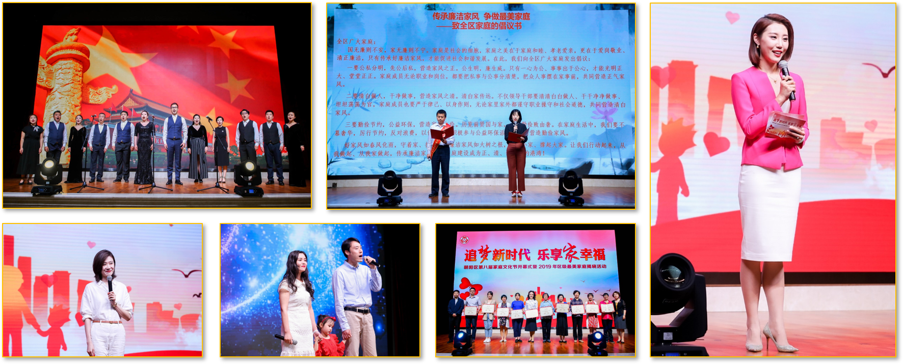 5月9日下午,国际家庭日前夕,朝阳区第八届家庭文化节在中复大厦拉开帷幕,200余人因家团聚、为爱发声。活动现场揭晓了2019年196户区级最美家庭名单,同时对12个最佳组织单位进行表彰。“大国小家”最美家庭宣讲团的成立,则是本届家庭文化节最大亮点。区妇联通过对2015年以来的732个家庭逐个选拔,优选10个家庭作为宣讲团成员,他们将在国庆节来临之前面向社区、机关、企事业单位等各个层面,讲述“最美家庭”的温暖故事,展现朝阳区家庭文化的深刻内涵和道德力量。