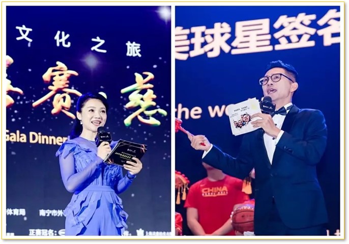 8月3日晚,2019姚基金慈善赛·慈善晚宴在南宁五象山庄举行,包含南宁市政府领导、中美篮球明星、多为世界冠军及艺术家、企业家近五百位各界爱心人士出席晚宴。著名主持人、制片人周群和中国第一位外资拍卖行拍卖师灵锋,分别出任慈善晚宴主持人和拍卖师。